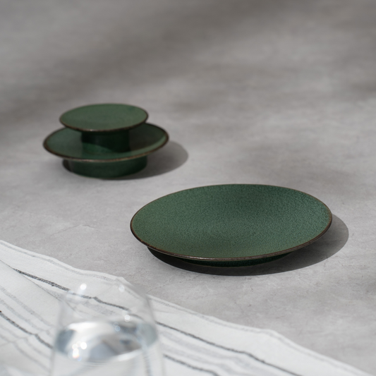 器の表面は、奥行きと温かみを感じさせる独特の質感。コンパクトなサイズながら、存在感のあるフォルムがテーブルを引き締め、コーディネートをワンランクアップさせます。パープル、グリーン、ブラックの3カラー展開です。